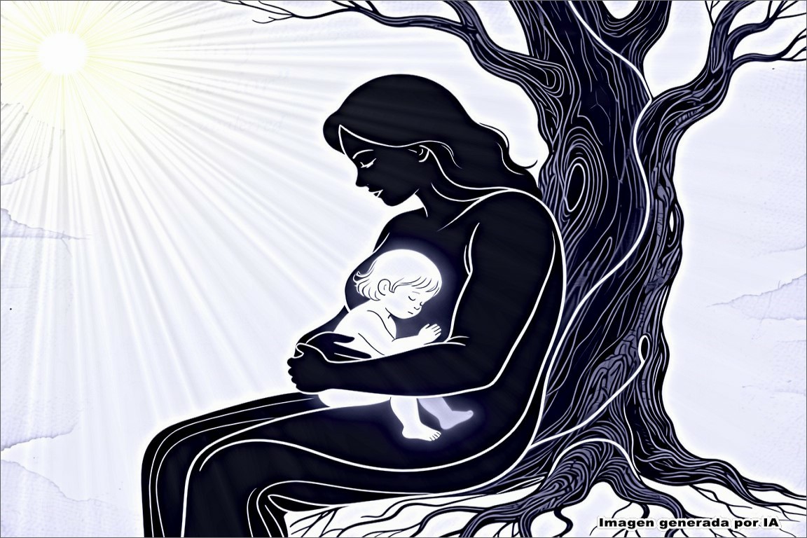 Un dibujo con una sola silueta, un solo contorno. Un árbol, mi yo adulto y mi niña interior sentada en mi regazo, en un solo trazo, mi espalda perdida en parte del tronco y mi niña perdida entre mis brazos…